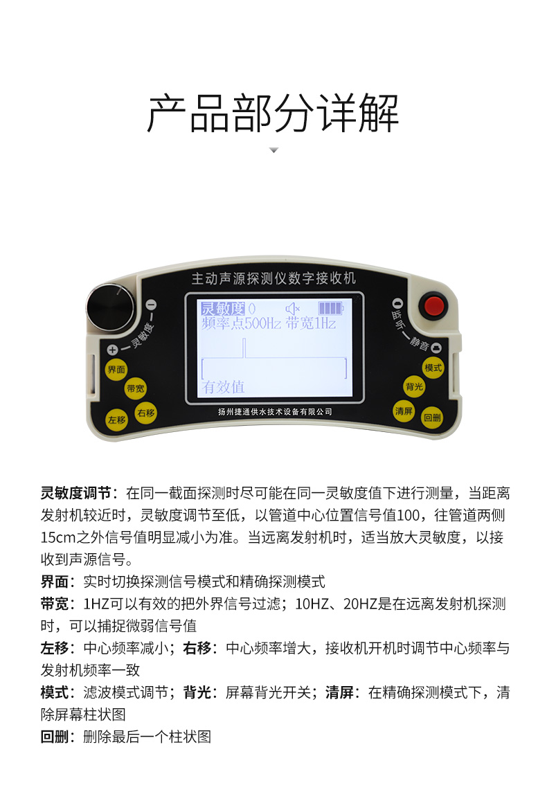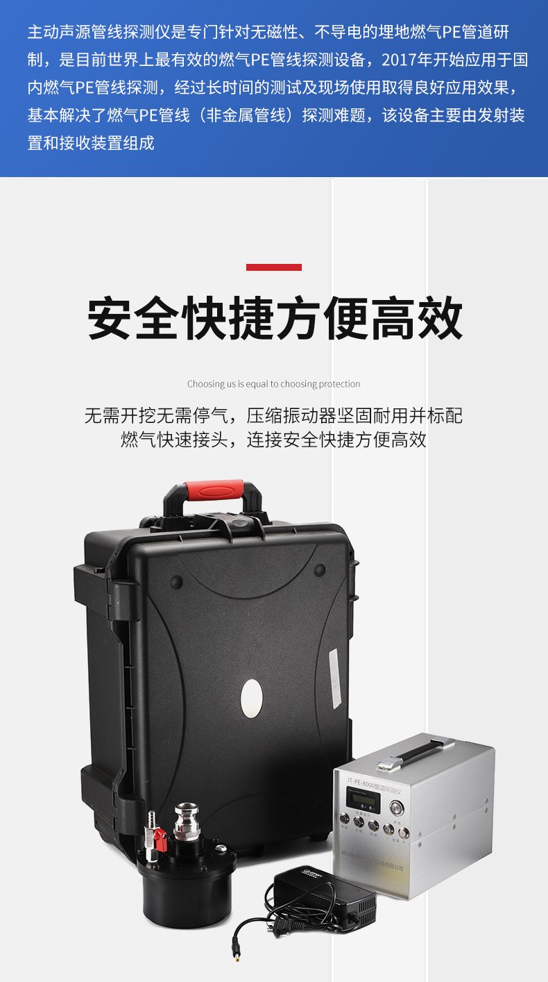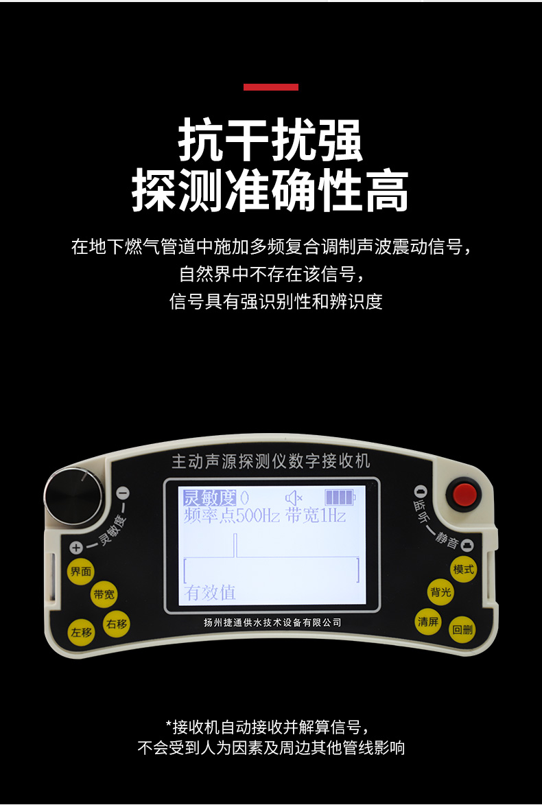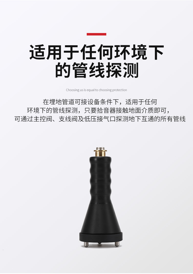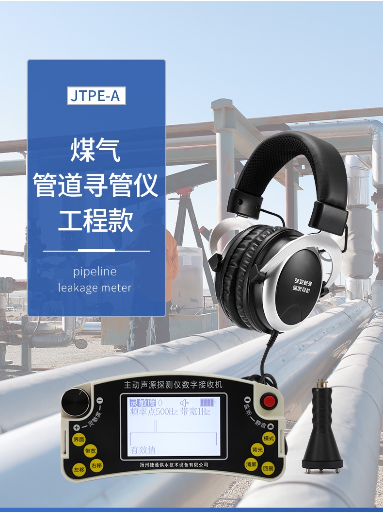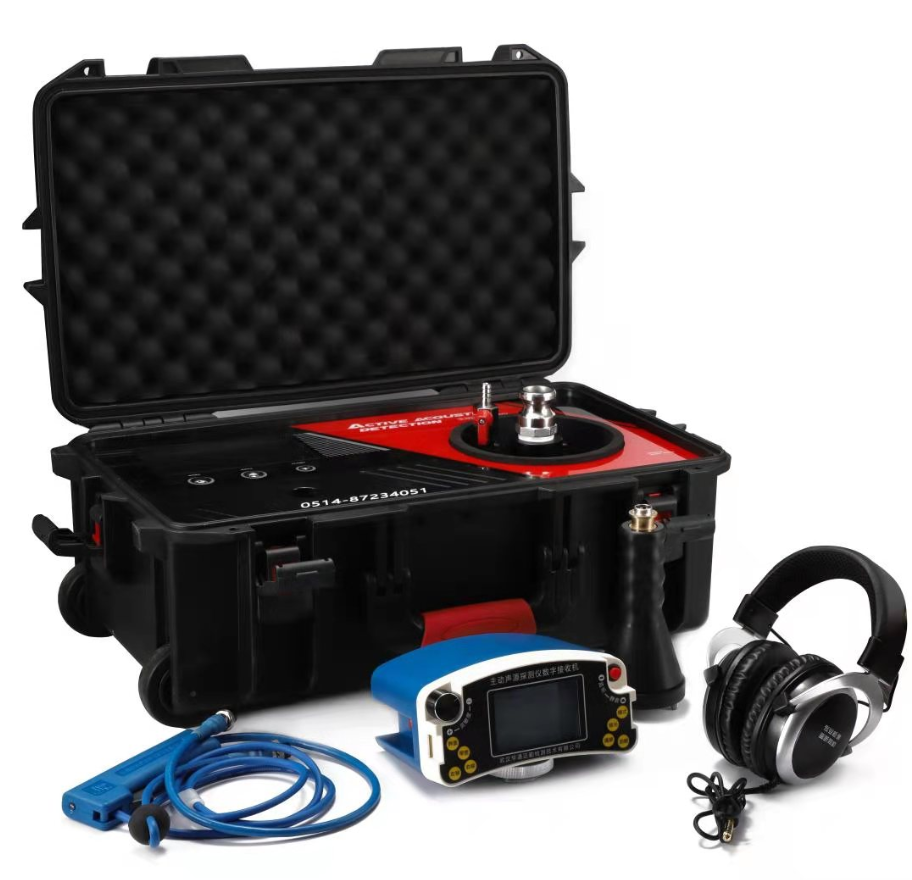 主动声源探测法工作原理是通过音频器发射装置向管道内发射特定频率的声波信号,信号沿管道定向传播至远端,该声波信号在管道压力气体中定向传播的同时,通过管壁土壤立体传播至地面;同时接收机在地面上捕捉该声波信号,通过持续接收信号的音量区找到该管的垂直扰动范围而做到精确定位